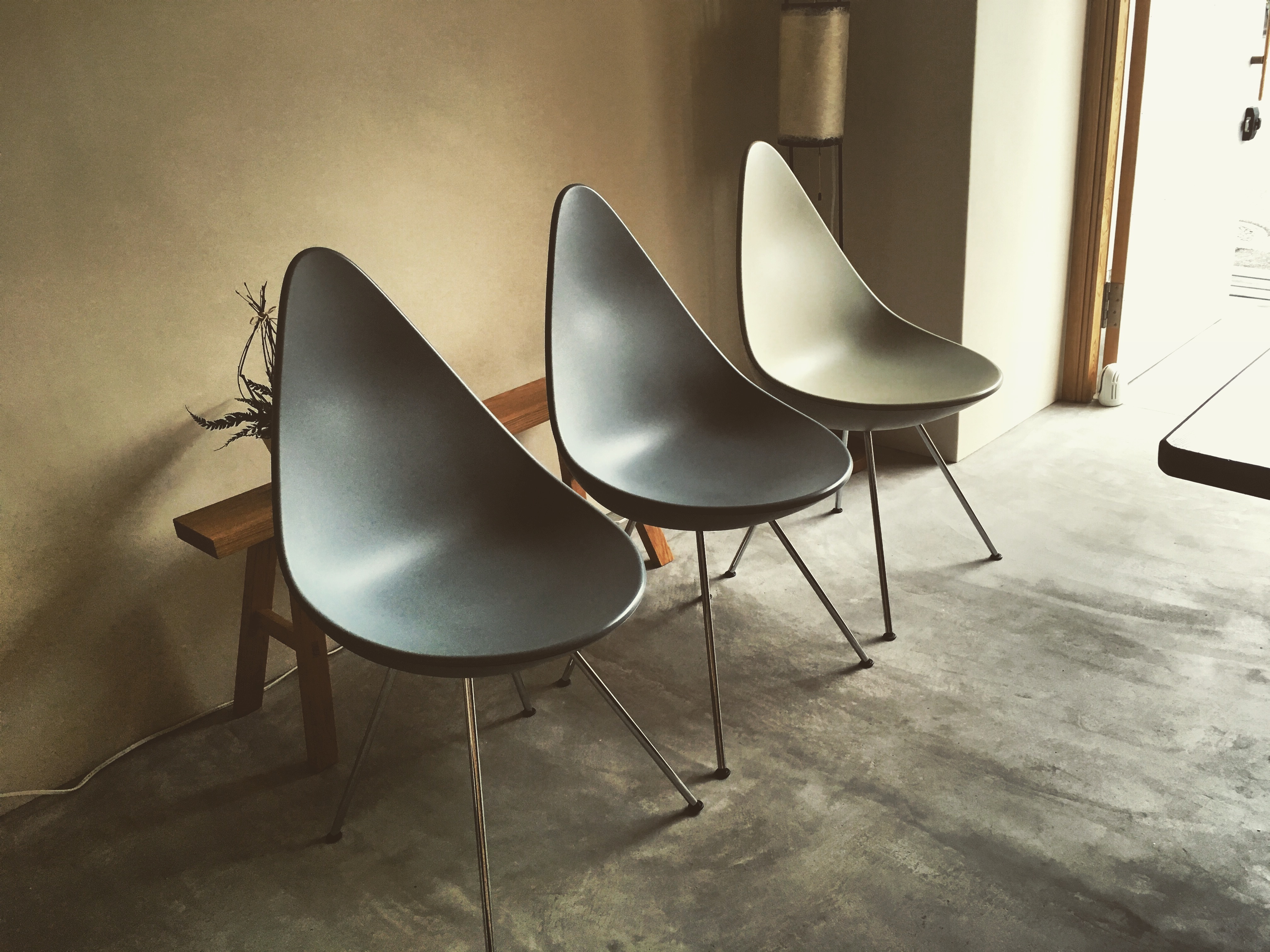 3月に注文して以来、日本にやってくるのをずぅーっと待ってた新しいお椅子、本日なみやに仲間入り♪コロンと可愛く美しいシルエット、ヤコブセンのドロップチェア。座りに来てねー。