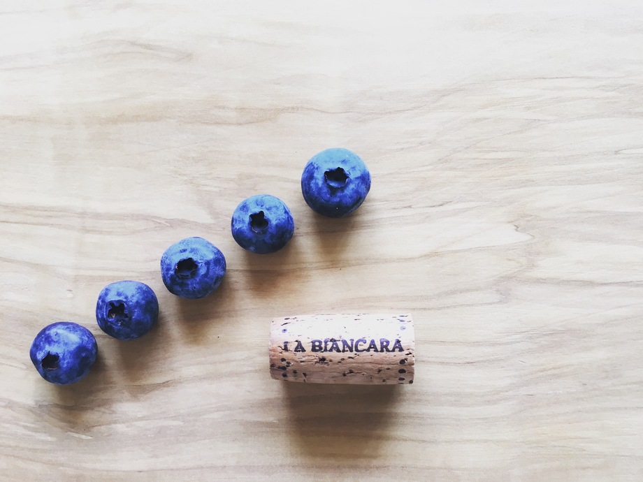 届けて頂いたブルーベリーの粒の大きさに驚愕。*比較対象用コルクは普通の大きさのもの。